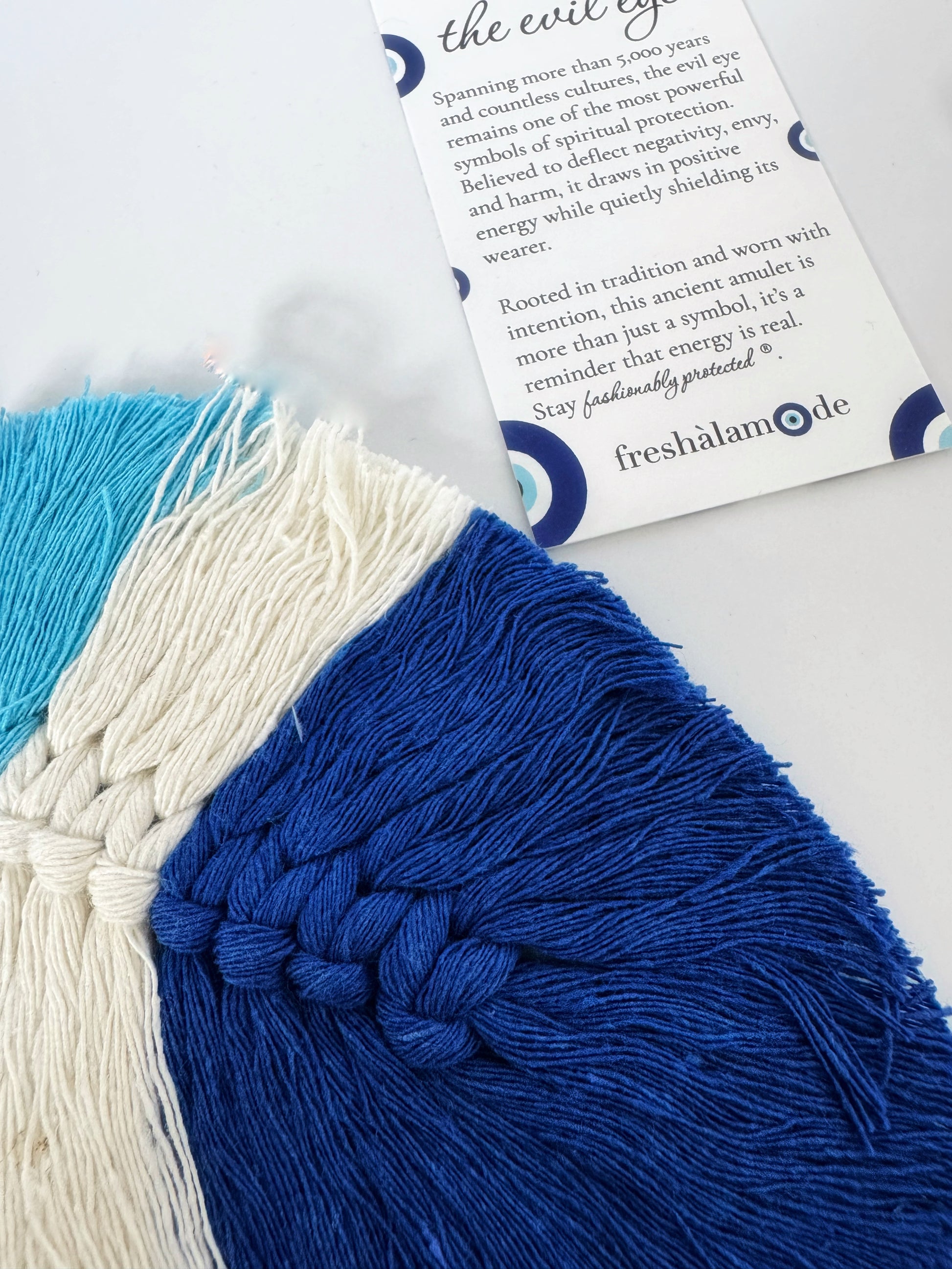 Invite calm energy, beauty, and protection into any space with this handcrafted Evil Eye Dreamcatcher. Designed in rich Mediterranean blues and soft neutrals, each piece features a crochet-woven evil eye centerpiece paired with a layered macramé feather. Light, airy, and full of intention, it’s the perfect blend of traditional symbolism and modern décor.