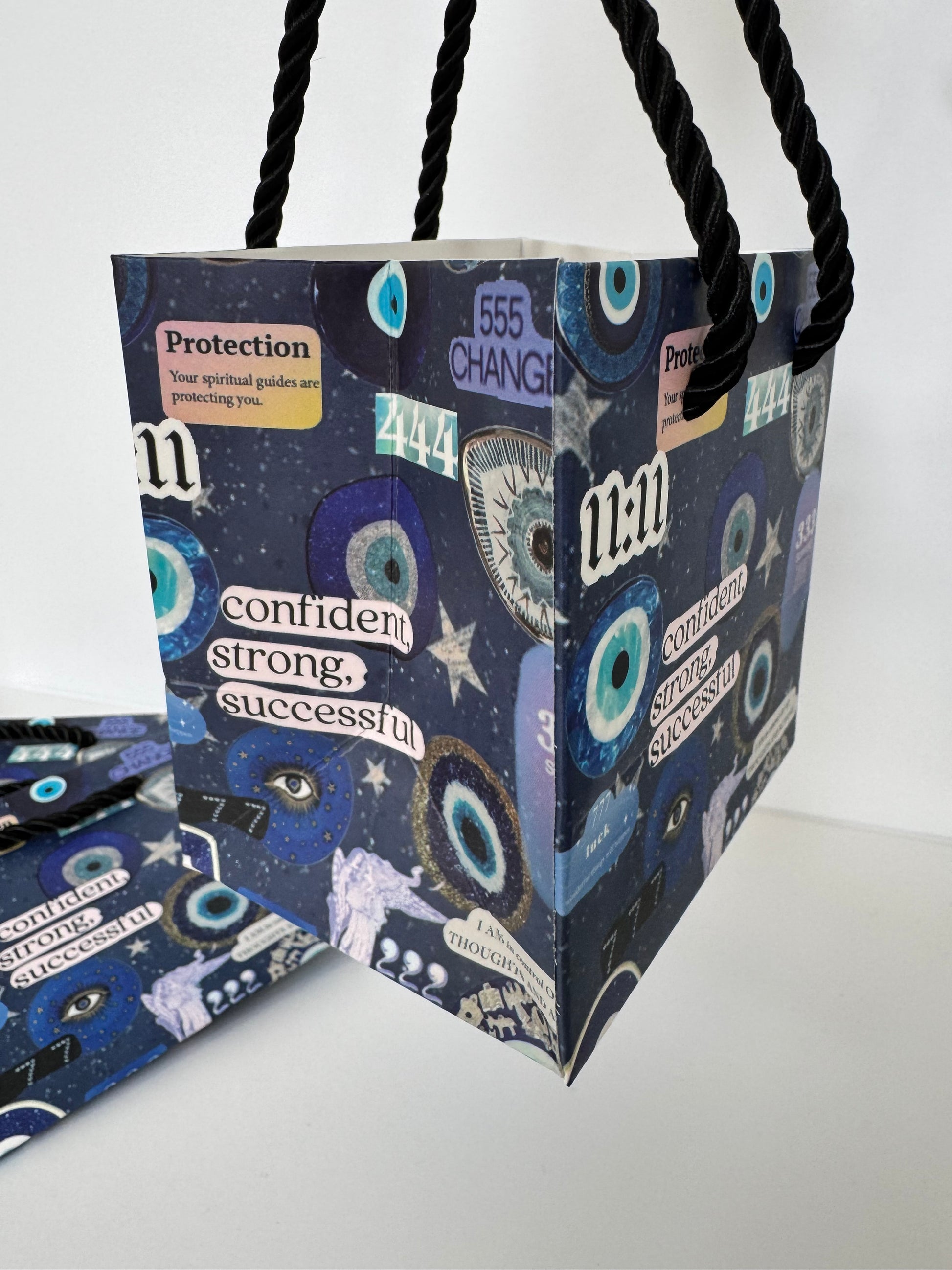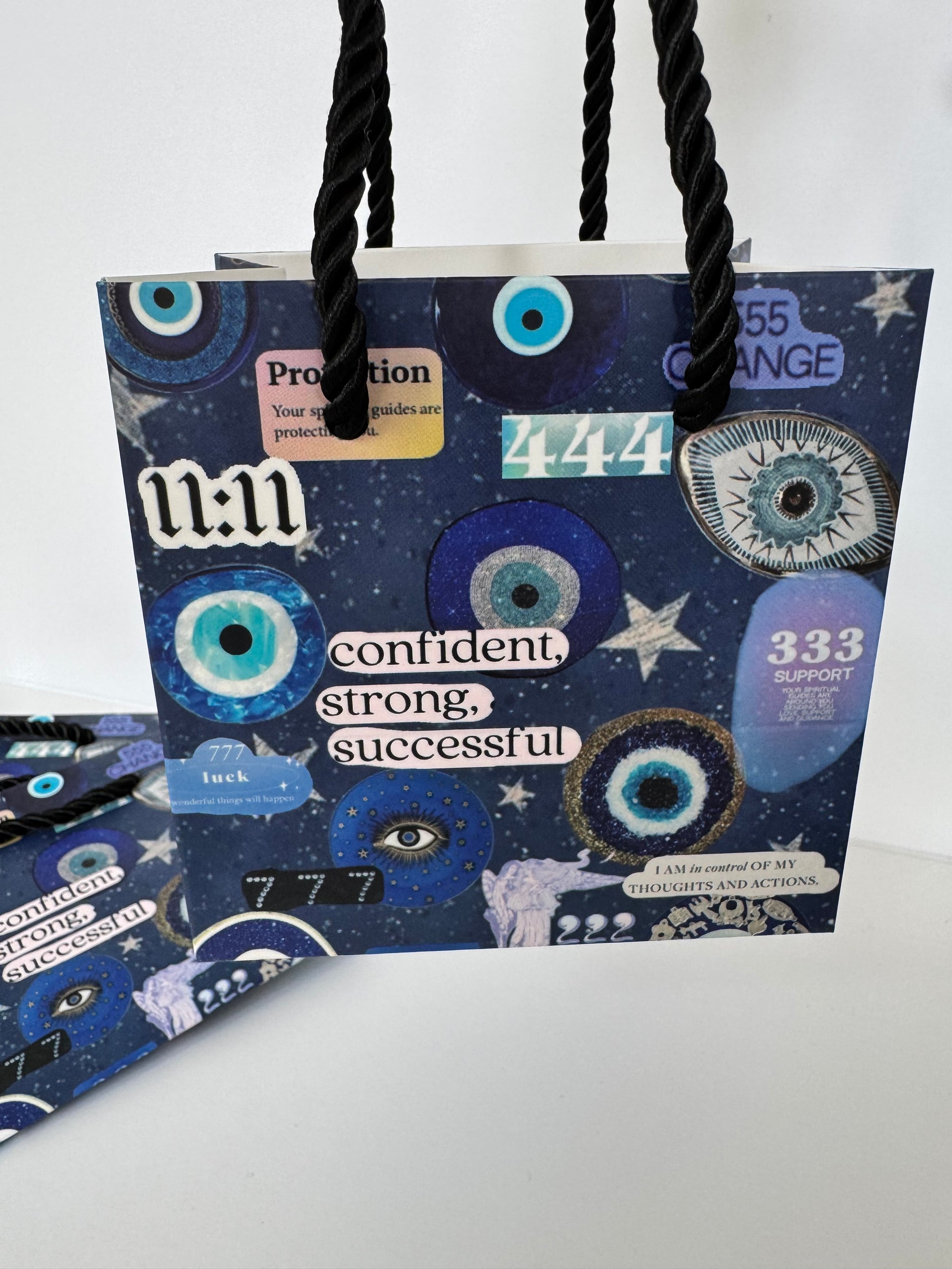 Designed and created exclusively by me, these premium FP gift bags turn any present into a luxury experience. Featuring my signature custom collage artwork, bold evil eye imagery, powerful affirmations, and angel number details, every inch of this bag radiates good energy and intention.
