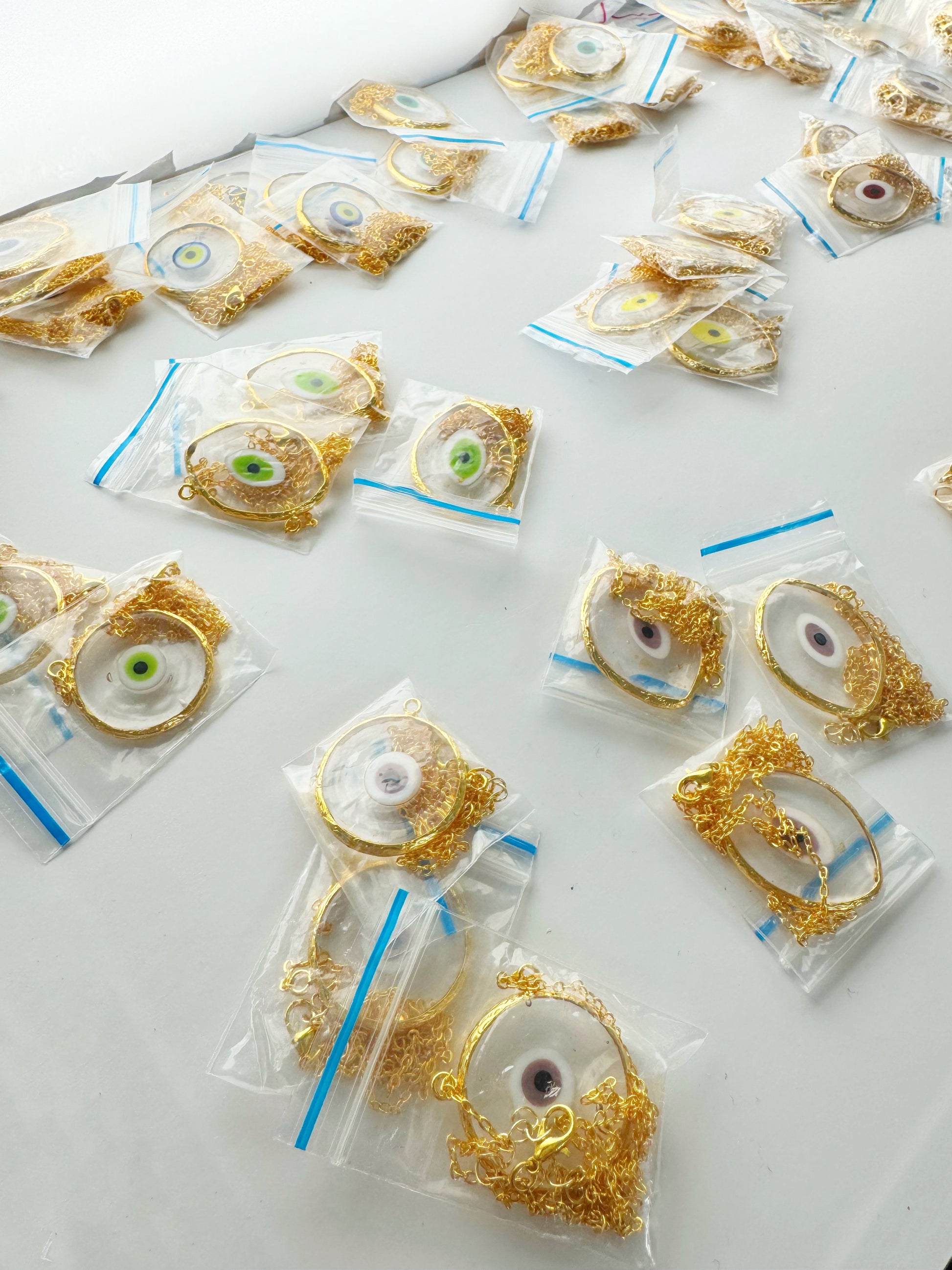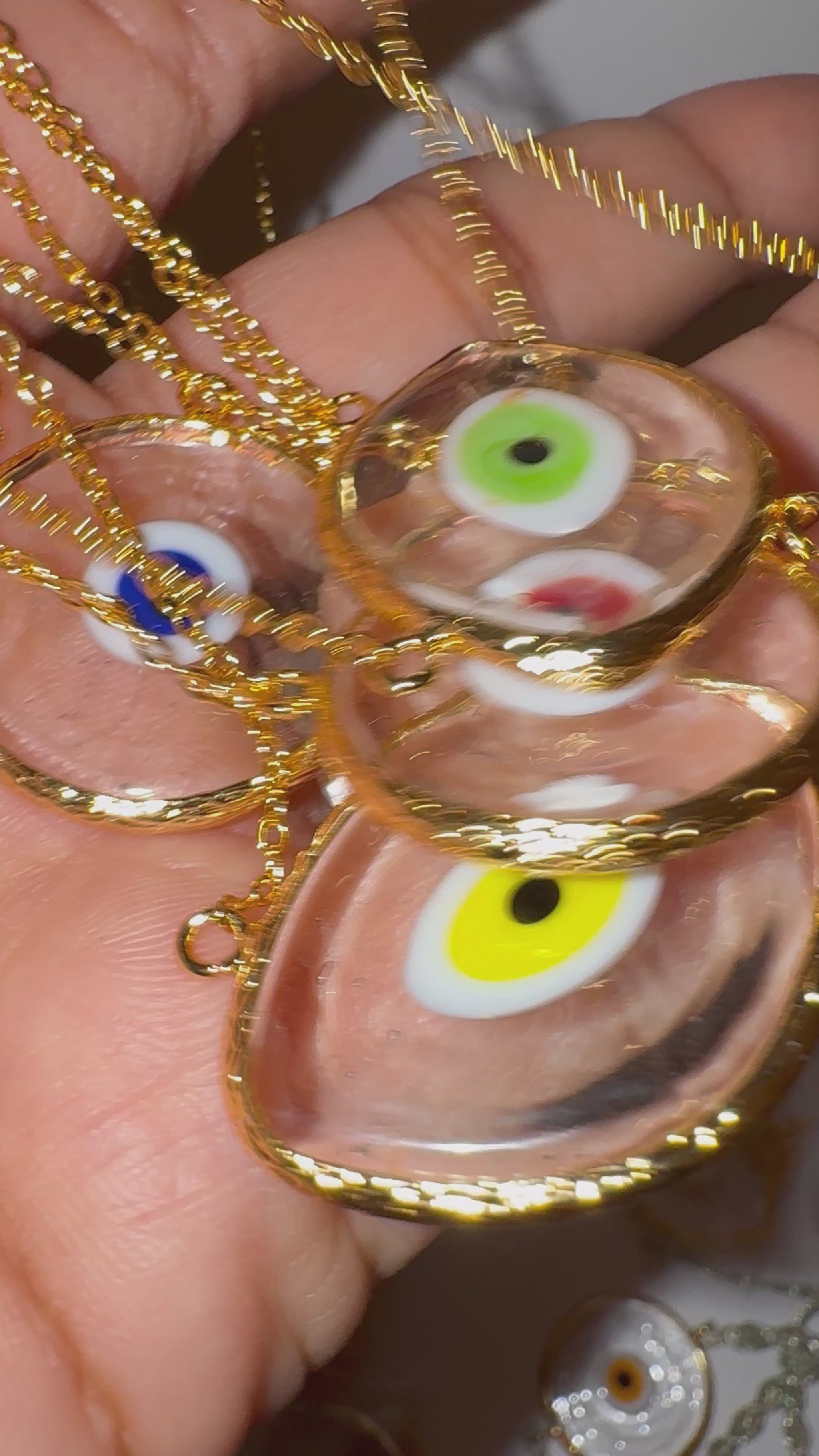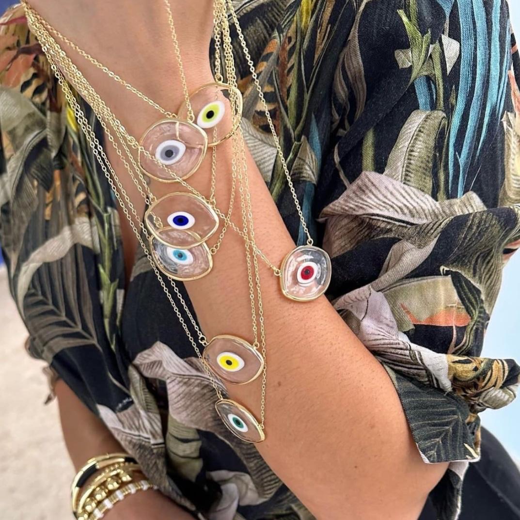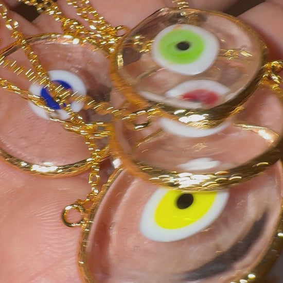 These iridescent glass evil eye amulet necklaces are made with clear, luminous glass and framed in golden brass, creating a radiant piece that catches light from every angle. Each amulet is completely one of a kind, no two are ever the same.